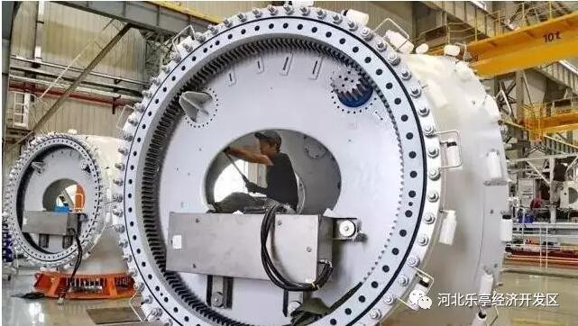 坐落于乐亭经济开发区的海上风电建设基地项目于2015年5月开工建设,同年10月举行试生产启动仪式,现已具备单机功率4MW以下的海上、陆上风机的生产能力及风力发电机组机舱以及轮毂的总装和调试能力。