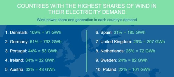 从欧盟成员国来看,丹麦的风力发电量产生剩余,是其国内需求的1.09倍,德国风力发电量占其国内需求的61%。