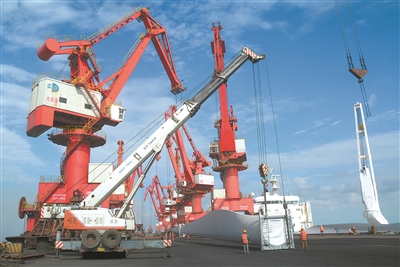 26日,大丰港通用码头正在吊装风电设备准备运销澳大利亚。大丰港今年外贸进出口量预计将超过1000万吨,同比增长10%以上
