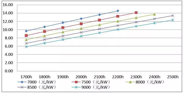图2:不同满发小时数和投资水平下的全部投资内部收益率图